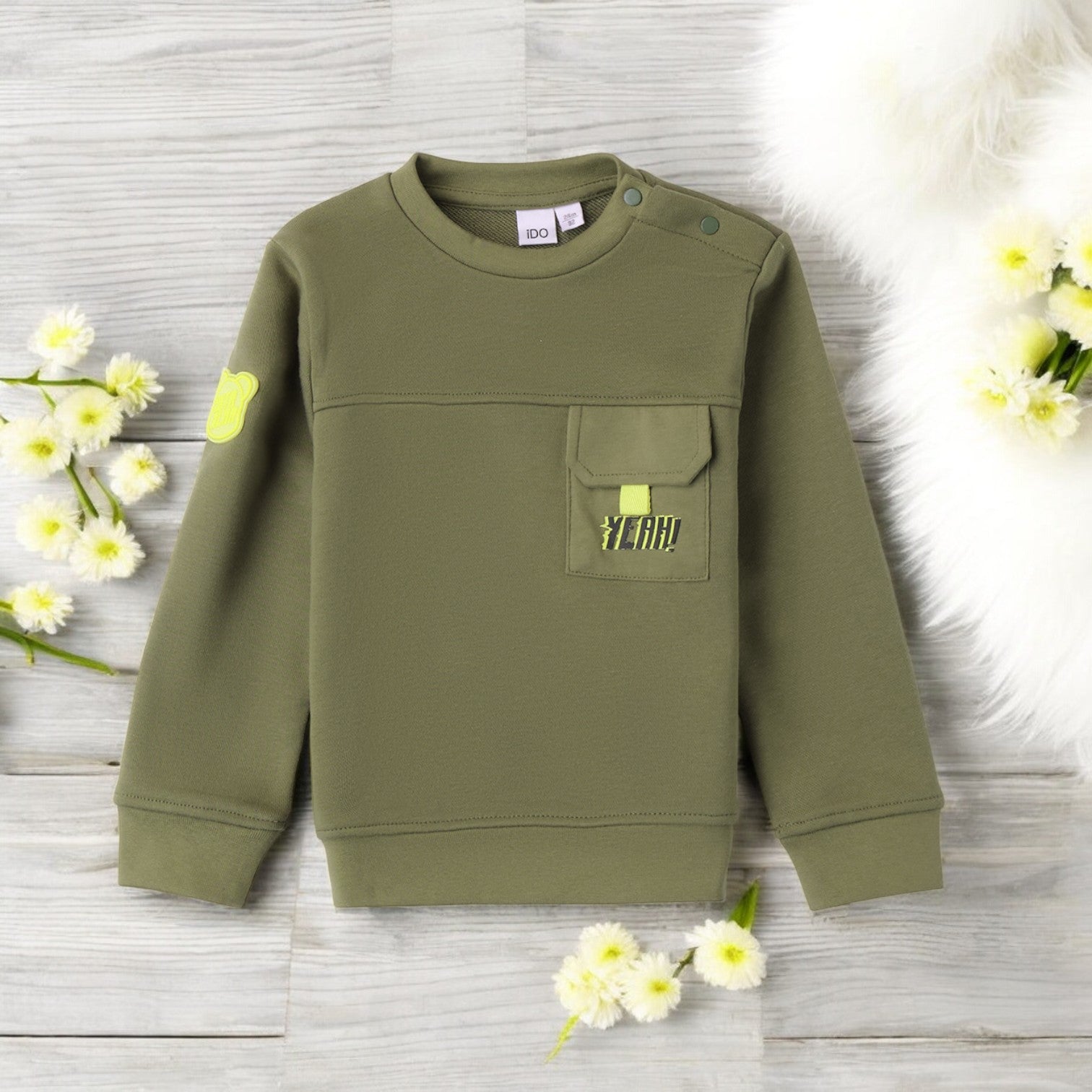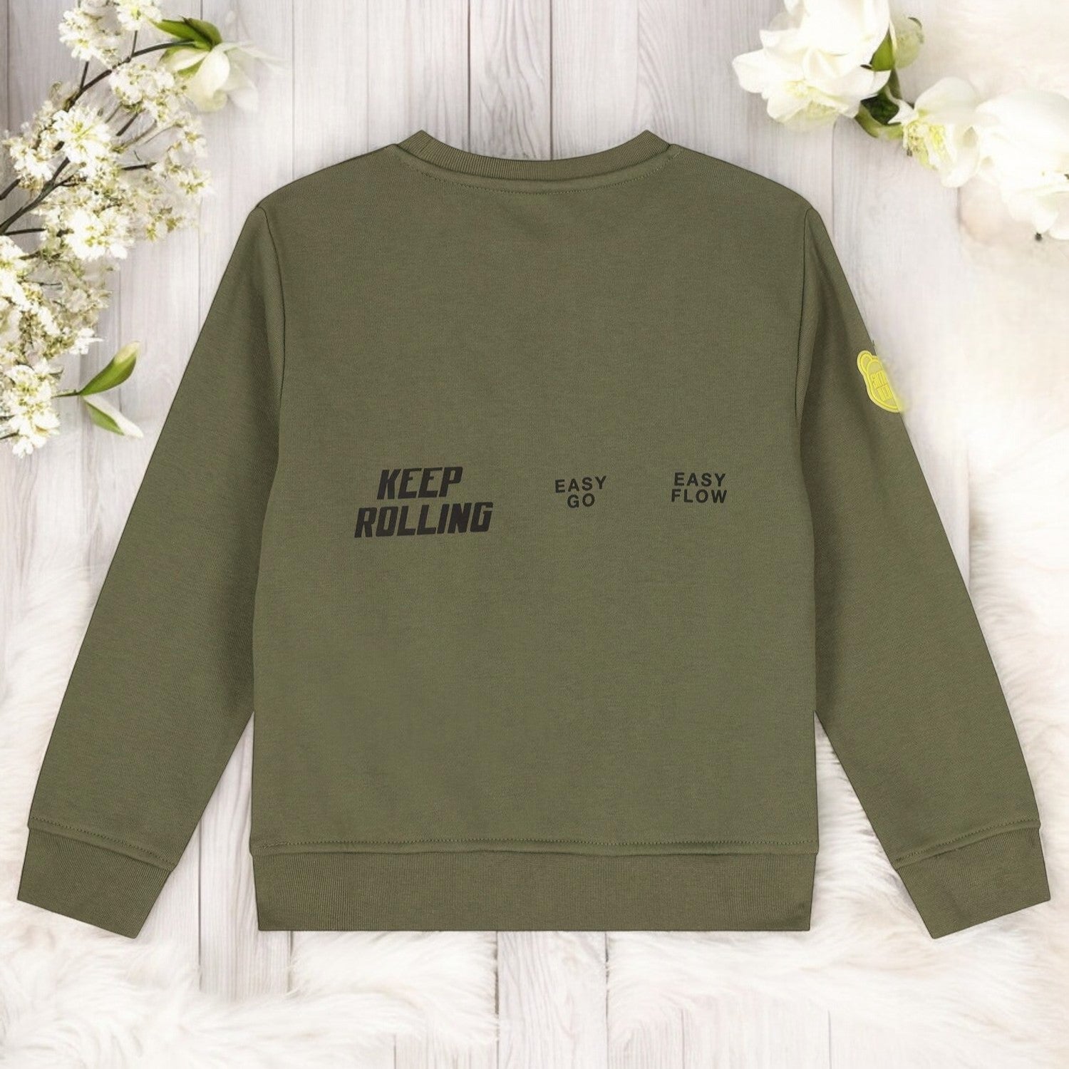 Khaki green long sleeve round neck jumper with a cute chest pocket and shoulder popper fastening, an a playful "keep rolling Easy go Easy flow" slogan on the back.