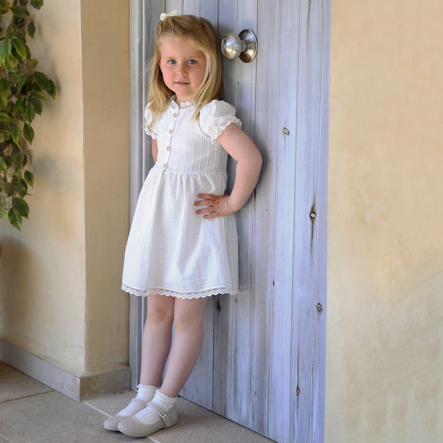 Ivory embroidered graph check dress with short puff sleeves with a lace trimmed collar, cuffs and hem with button fastening half way down the front.
