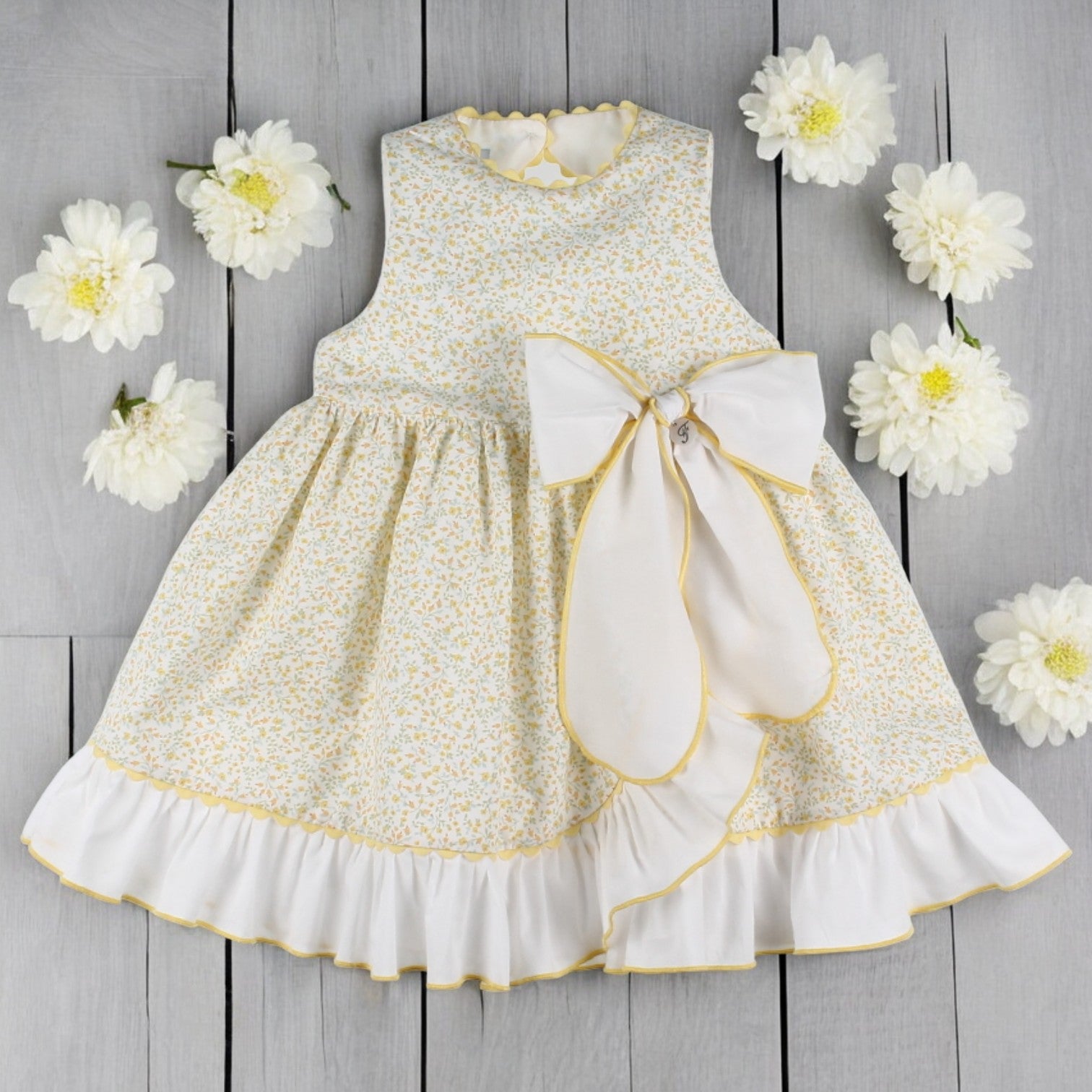 Beautiful lemon floral sleeveless dress with a white ruffle hem that sweeps up the front and an oversized white bow with lemon trims, key hole opened back and a concealed zip.