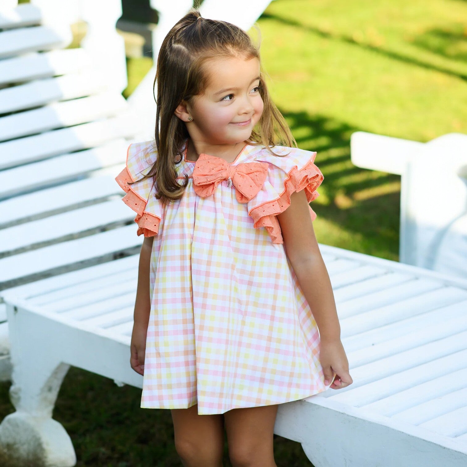 Pastel yellow, peach and pink gingham dress with ruffle layered short sleeves featuring a gorgeous broderie anglaise ruffle, a square neckline with a matching broderie anglaise bow and button fastening at the back.