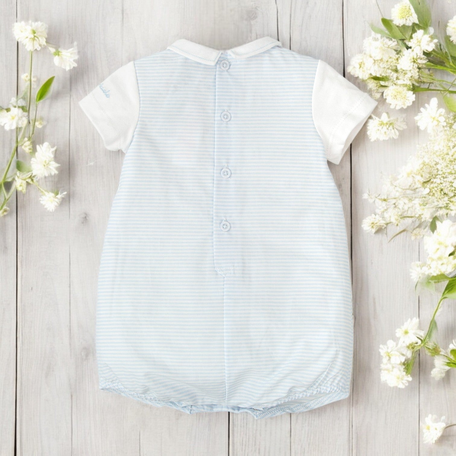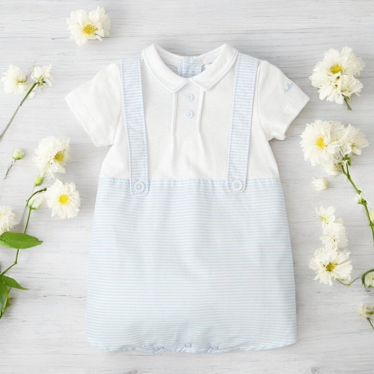 Sky blue & white romper by Tutto Piccolo.