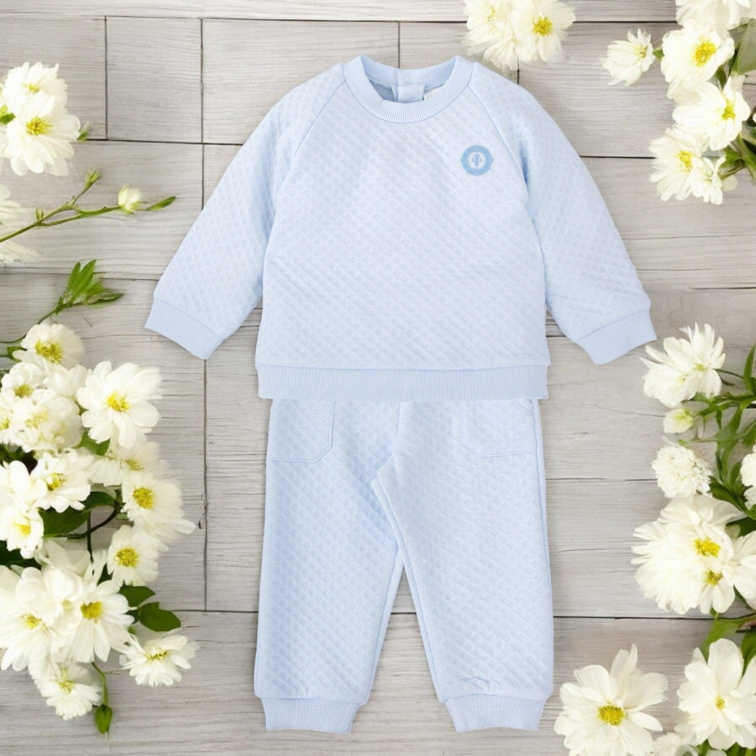 Sky blue super soft waffle leisure set with ribbed trims and popper fastening at the back of the jumper. Matching trousers with an elasticated waistband.