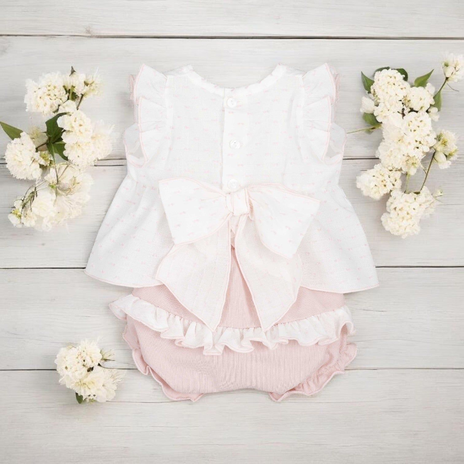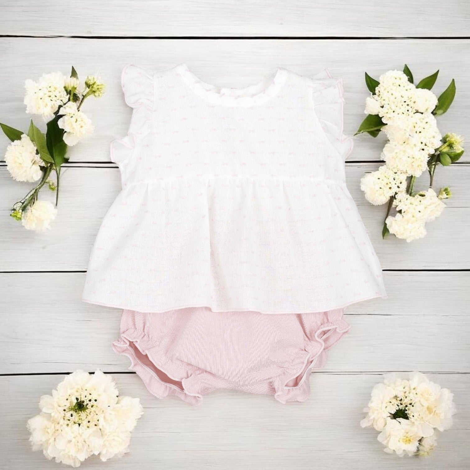 Ivory cotton top with a pink dobbie cotton design, ruffle capped sleeves an open lower back with a bow and button fastening soft comfortable and lightweight making it ideal for warmer months.